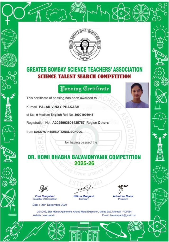 ग्रेटर बॉम्बे साइंस टीचर्स एसोसिएशन (GBSTA) द्वारा आयोजित डॉ. होमी भाभा बालवैज्ञानिक प्रतियोगिता 2025–26 में सफलता प्राप्त कर पलक ने न सिर्फ़ परीक्षा Pass की, बल्कि यह साबित कर दिया कि ग्रामीण पृष्ठभूमि से निकलकर भी राष्ट्रीय स्तर की वैज्ञानिक सोच विकसित की जा सकती है—बस ज़रूरत है सही मार्गदर्शन, कड़ी मेहनत और आत्मविश्वास की।
